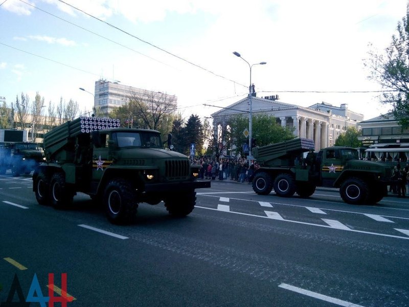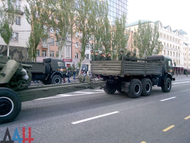 Боевики "ДНР" прошли по центральной улице Донецка. На репетицию вышло 13 единиц военной техники, включая танки, БМП и артиллерию. НВФ прошли под аккомпанемент духового оркестра Донецкой филармонии, исполнившего "мелодии военных лет".