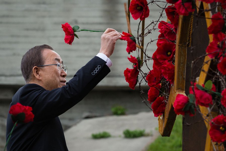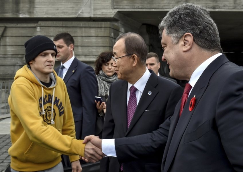 Как передает пресс-служба президента Украины, Порошенко представил Пан Ги Муну участников открытия инсталляции. Среди них был руфер Мустанг, который установил символический венок. Мустанг отметил, что они "маковый венок" с национальными лентами они водрузили на монумент "в память о тех людях, которые защищали нашу страну. Чтобы мы не забывали и помнили".