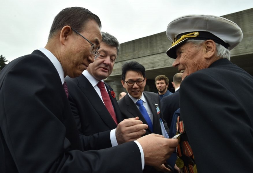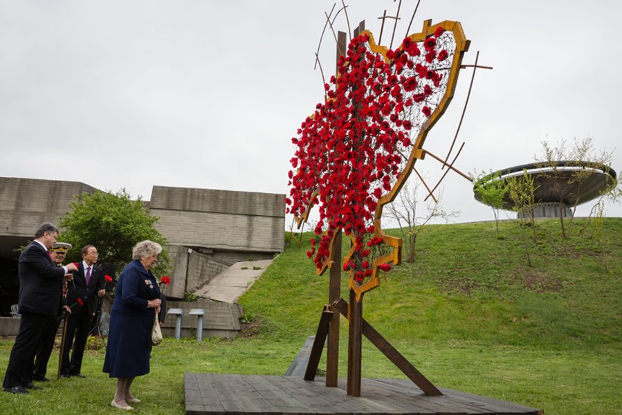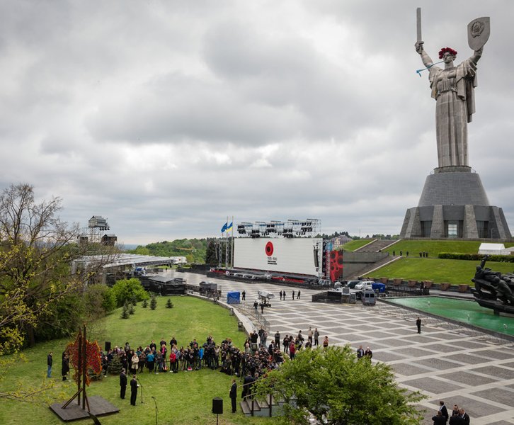 На территории столичного Музея истории Великой Отечественной войны, где находится "Родина-мать", 8 мая прошли торжества с участием президента Украины Петра Порошенко и генерального секретаря ООН Пан Ги Муна.