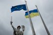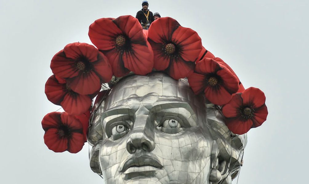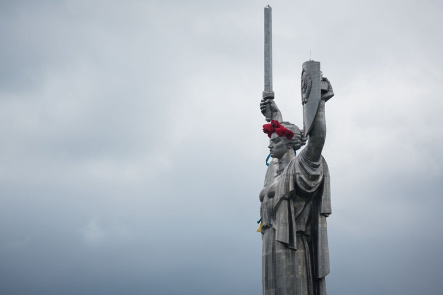 Монумент "Родина-мать" в Киеве украсили "маковым венком" и лентами цветов украинского флага в День памяти и примирения.