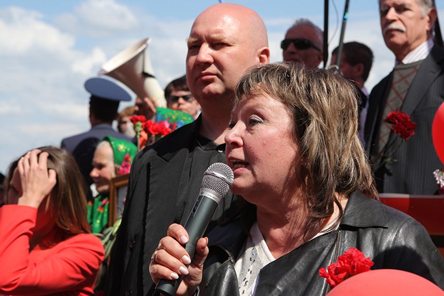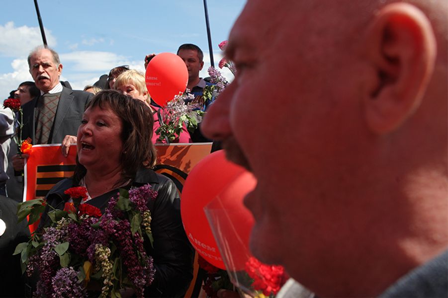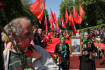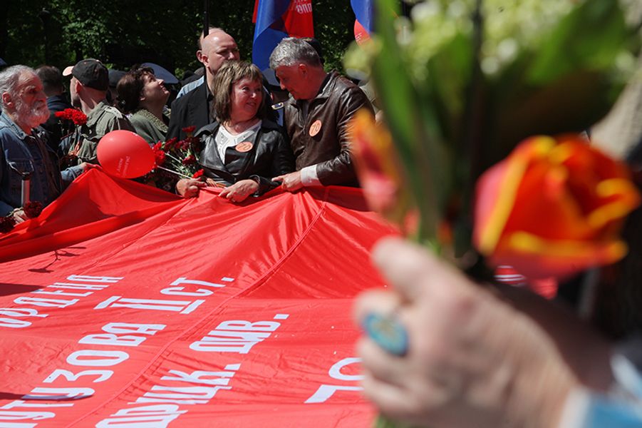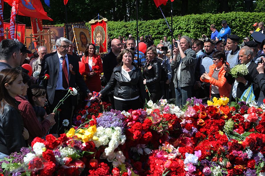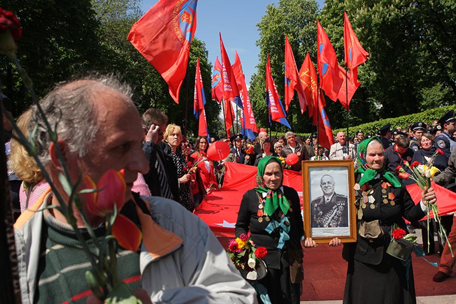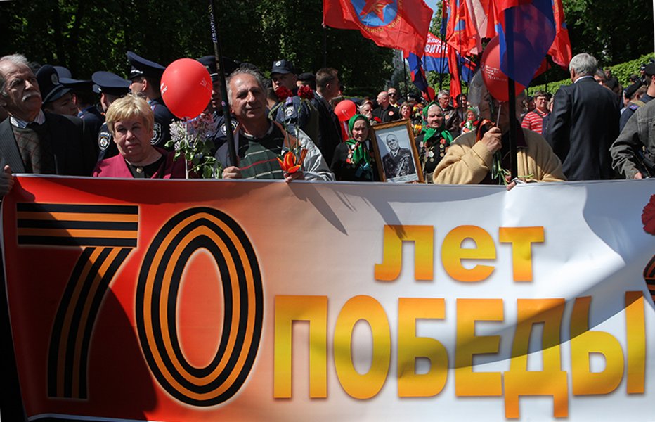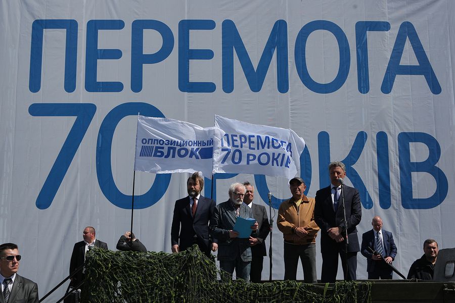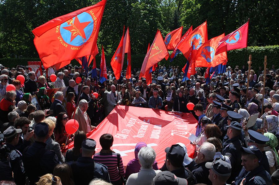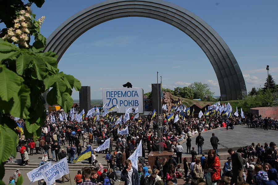 "Оппозиционный блок" и представители левых сил у арки Дружбы народов в центре Киева провели акцию, посвященную 70-летию Победы в Великой Отечественной войне.