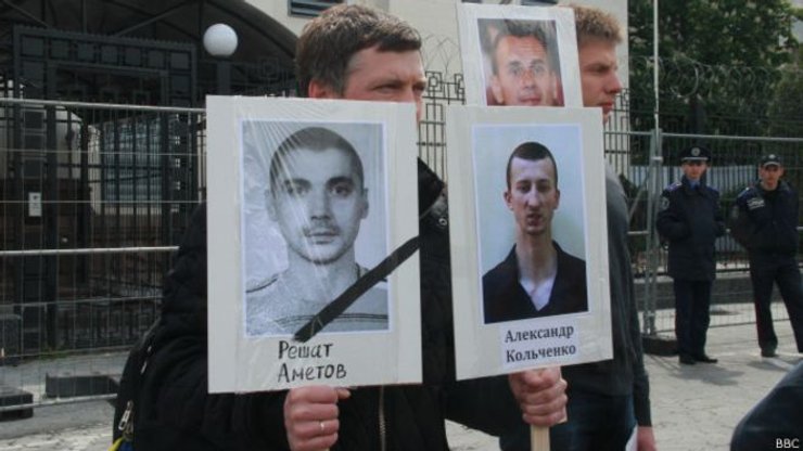 Несколько десятков человек пикетировали посольство Российской Федерации в Киеве с требованием освободить граждан Украины, задержанных российскими властями в Крыму, и выяснить судьбу пропавших без вести на полуострове, сообщает BBC.