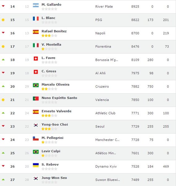 Тренер киевлян занял 26 место, опустившись на 6 позиций по сравнению с мартовским рейтингом, а Маркевич, который вывел подопечных в финал Лиги Европы, поднялся с 39 на 31 строчку.
