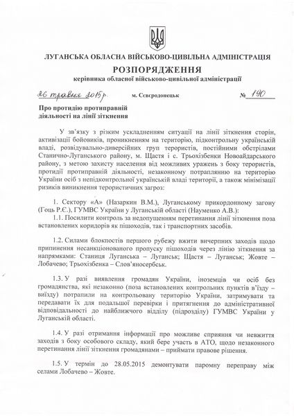 Как говорится в документе, военные и правоохранители должны прекратить несанкционированный пропуск пешеходов через линию соприкосновения в направлениях от Станицы Луганской и Счастья в оккупированный Луганск, из сел Лобачево и Трехизбенка в село Желтое и Славяносербск, захваченные террористами.