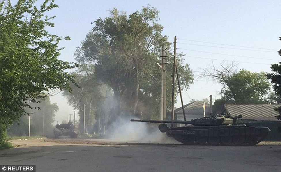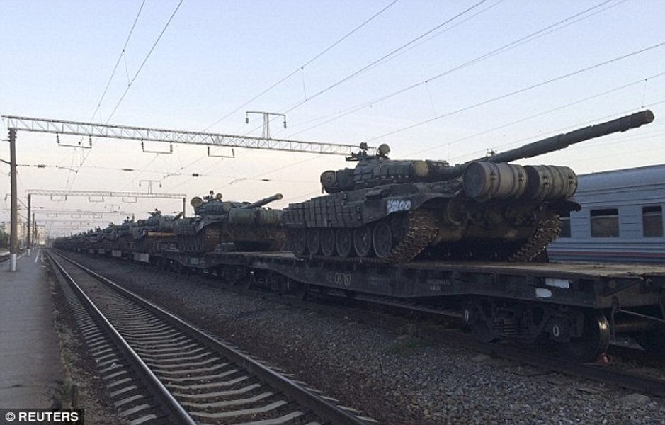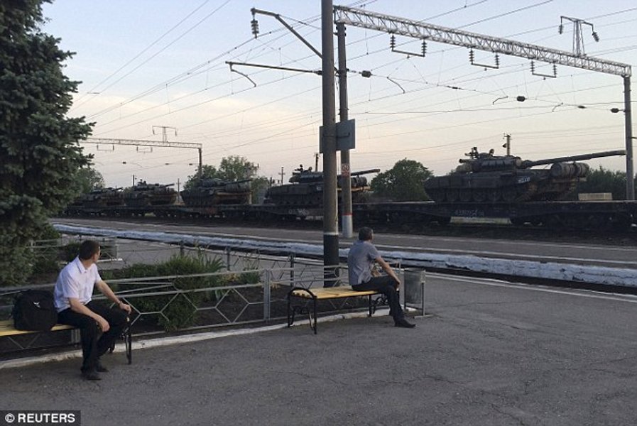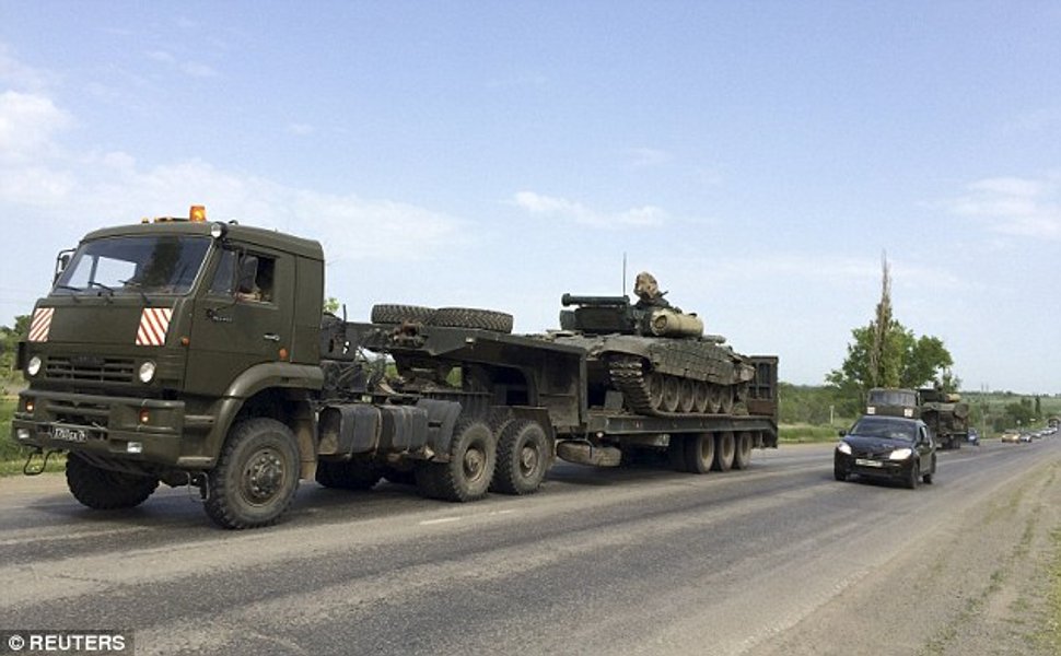 В российском городе Матвеев Курган на границе с Украиной, зафиксирована колонна из девяти танков, сообщает Daily Mail и приводит фотографии Reuters.