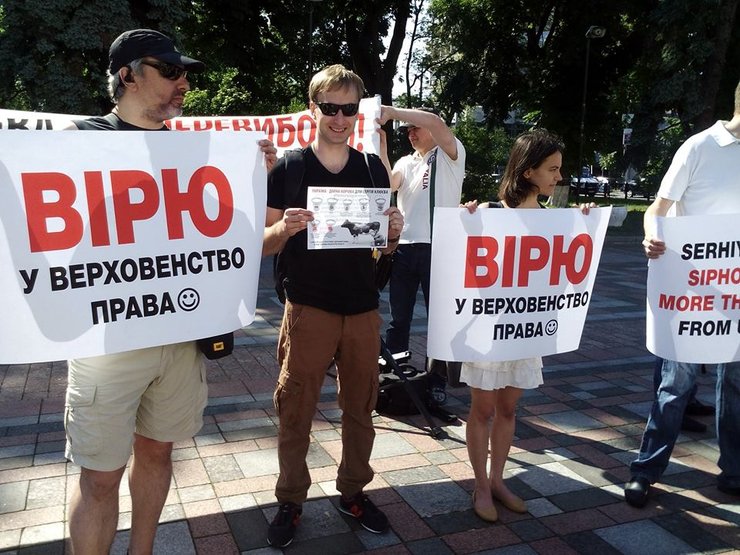 Около 15 активистов требуют снять неприкосновенность с народного депутата Украины Сергея Клюева под зданием парламента. Пикетчики установили импровизированную клетку, куда посадили "Клюева", передает "РБК-Украина".