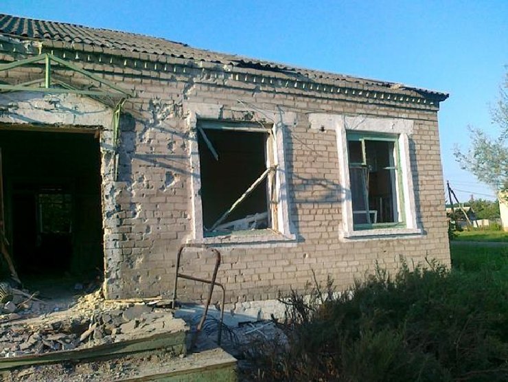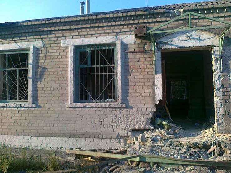 В местах прямого попадания снарядов в стены здания отсутствуют целые фрагменты кирпичной кладки, выбито остекление.