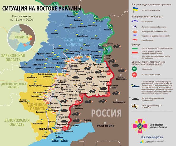 Пресс-служба Минобороны предоставила карту ситуации на востоке Украины по состоянию на 00.00 воскресенья, 15 июня