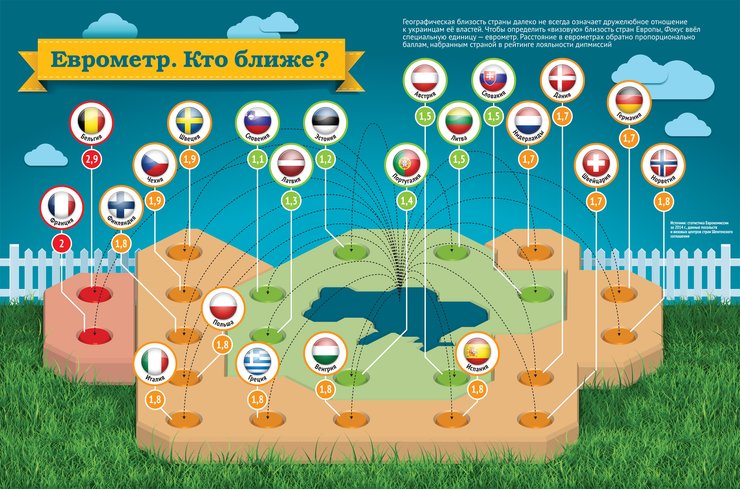 Чтобы определить "визовую" близость стран Европы, Фокус ввел специальную единицу — еврометр. Расстояние в еврометрах обратно пропорционально баллам, набранным страной в рейтинге лояльности дипмиссий.