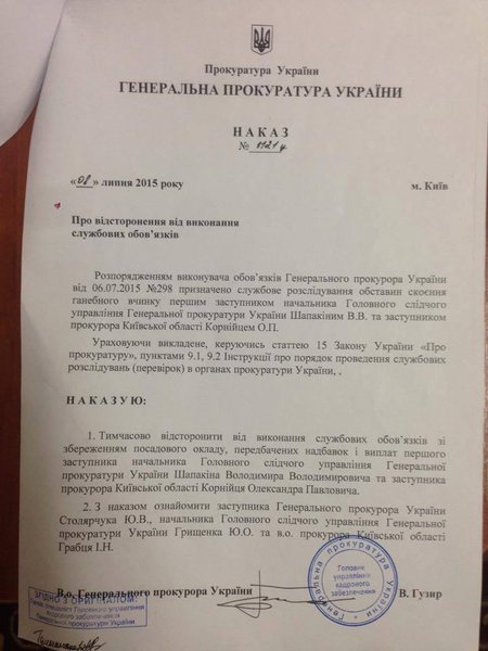 "Это сюр. Оказывается, прокурорские чиновники, у которых на минувшей недели прошли обыски, до сих пор не уволены! В приказе и.о. Генпрокурора Владимира Гузыря говорится, что чиновников отстраняют временно, за совершении "позорного поступка". О каком именно поступке идет речь, не уточняется, но, очевидно, степень "позора" еще не настолько велика, чтобы чиновников увольнять", - сообщил Найем.