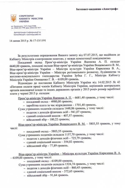 В июне премьер-министр Арсений Яценюк заработал 6681 грн 40 коп., из которых должностной оклад составил 4980 грн.