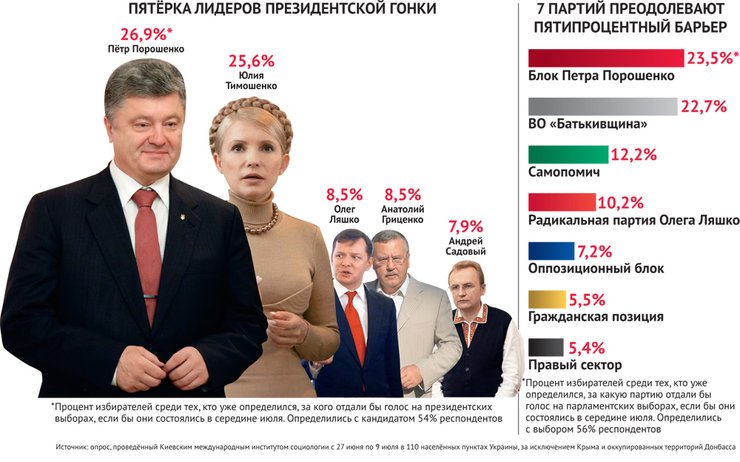 Последний соцопрос Киевского международного института социологии потряс результатами: рейтинги Блока Петра Порошенко и Батькивщины почти сравнялись. Если бы парламентские выборы состоялись в июле, на избирательные участки пришло бы около 56% граждан Украины. Из уже определившихся с выбором 23,5% и 22,7% проголосовали бы за БПП и партию Юлии Тимошенко соответственно. Всего пару месяцев назад ситуация была иной: в мае из 39% определившихся с выбором избирателей 21,2% планировали отдать свой голос за БПП, 15,3% — за Батькивщину. Разрыв между двумя политсилами сократился с 6% до 0,8%, то же самое произошло с рейтингами их лидеров: если в мае в рейтинге электоральных симпатий Петр Порошенко опережал Юлию Тимошенко на 15%, то в июле — лишь на 1,3%. И это при том, что год назад на президентских выборах нынешний глава государства опередил экс-премьера на 42%: за Порошенко проголосовало больше половины украинцев, за Тимошенко — лишь 12,8%.