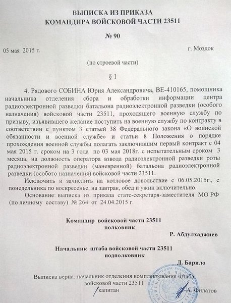 Обнаруживший себя солдат служит по контракту оператором взвода радиоэлектронной разведки части №23511. В выписке из приказа указан и номер личного жетона Собина – ВЕ-410165.