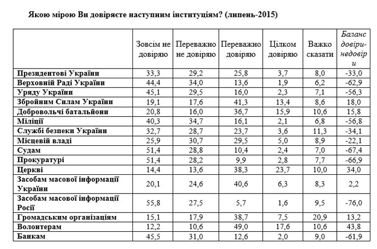 Также положительным является баланс доверия-недоверия к общественным организациям (+13%) и к средствам массовой информации Украины (+2%), однако динамика в отношении к этим учреждениям противоположная: доверие к общественным организациям растет (от 9% в 2010 году до +13% в 2015), а к украинским СМИ падает (от +26% в 2010 году до +2% в 2015).