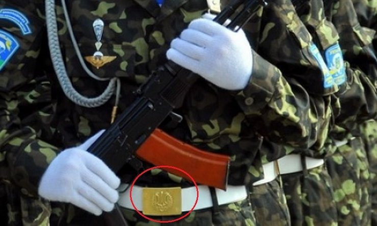 На пряжках ремней украинских "голубых беретов" можно разглядеть трезубец