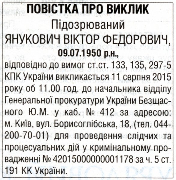Виктора Януковича в качестве подозреваемого вызывают 11 августа на 11.00 в ГПУ к начальнику отдела Юрию Безщасному для проведения следственных и процессуальных действий в уголовном производстве по ст.133, 135, 297-5 УПК.