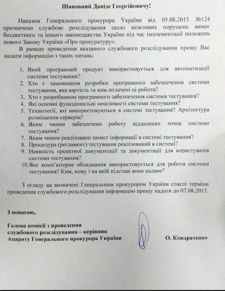 Издание опубликовало приказ генпрокурора Виктора Шокина о проведении соответствующей проверки. Председатель служебной комиссии и руководитель аппарата генпрокурора Александр Кондратенко попросил Сакварелидзе до 7 августа объяснить на каких основаниях, кем, когда и как была выдана система тестирования.