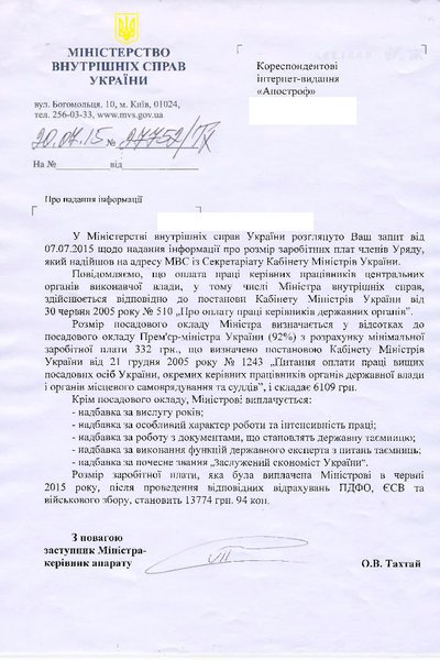 Как объяснили в аппарате правительства, глава МВД не подпадает под постановление, согласно которому в 2015 году заработная плата членам Кабмина, руководителям центральных органов исполнительной власти и других государственных органов начисляется исключительно в размере должностного оклада.