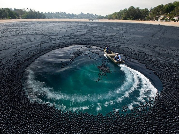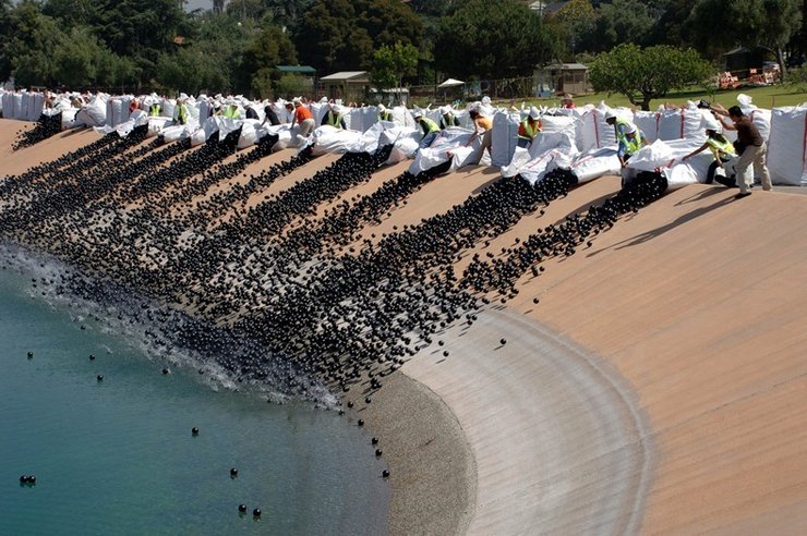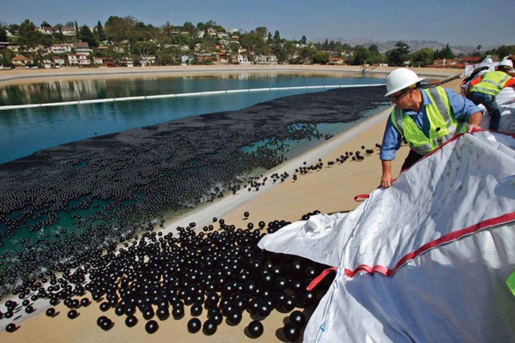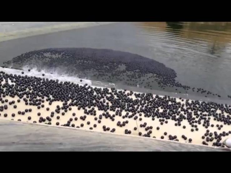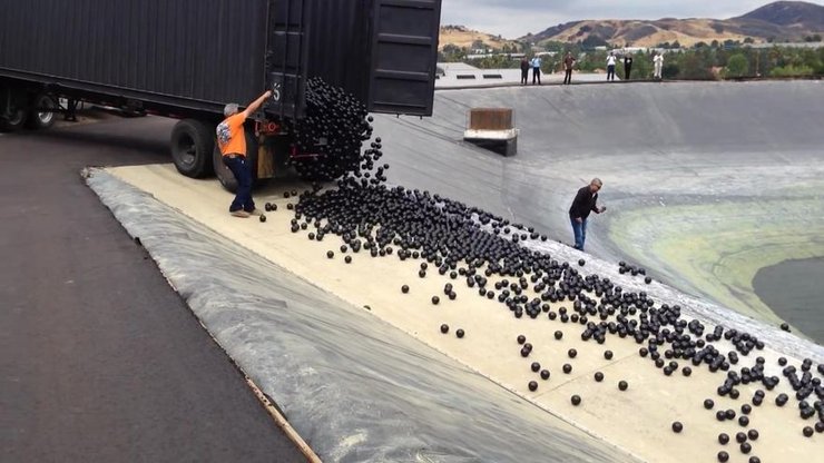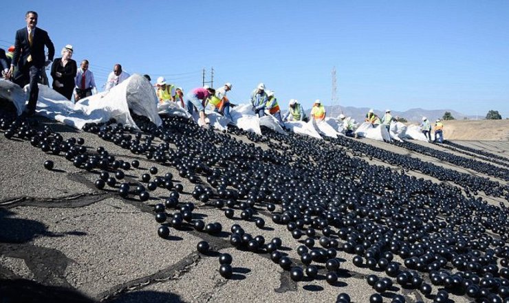 Доктор Барайн Уайт, пенсионер из Лос-Анжелеса, узнав о применении черных пластиковых шариков для отпугивания птиц от расположенных вблизи взлетно-посадочных полос водоемов, посоветовал воспользоваться этой технологией для защиты поверхности воды от палящих солнечных лучей.