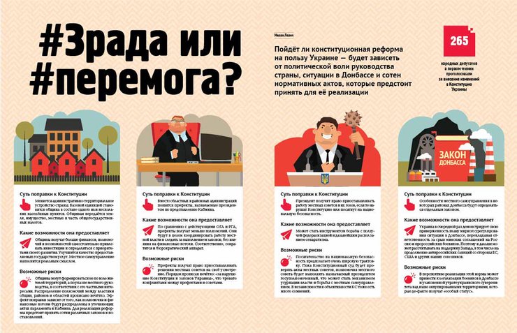 Впрочем, однозначно утверждать, что поправки к Конституции это "зрада" или "перемога" нельзя. Даже если Верховная Рада окончательно утвердит реформу, ее реальные последствия зависят от того, как именно пропишут распределение полномочий и финансовых потоков между советами общин, районов, областей и префектур в отдельных нормативных актах, какие изменения будут внесены в закон об "особом статусе" Донбасса и как он будет применяться на практике. Пока предлагаемые изменения в Конституцию сугубо рамочные. По словам соавторов реформы, предстоит принять не менее полутысячи нормативных актов разного уровня, которые наполнят ее реальным смыслом.