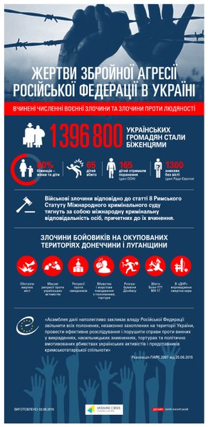 Согласно данным на инфографике, с начала боевых действий в Донбассе стали беженцами 1,4 млн граждан Украины (среди них 60% женщины и дети). Пропавшими без вести числятся 1,3 тыс. человек.
