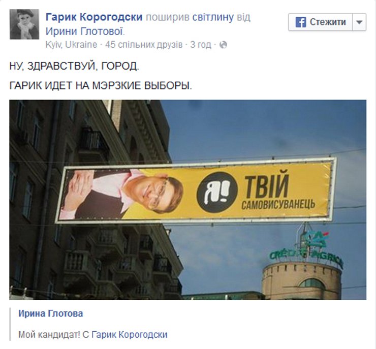 Одиозный киевский бизнесмен Гарик Корогодский намерен принять участие в выборах мэра столицы. Об этом он написал на своей странице в социальной сети Facebook.
