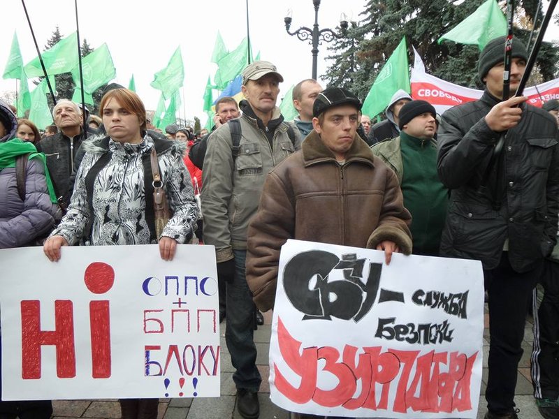 Городская сумасшедшая, которая приходит на каждый митинг у Рады, женщине из толпы: "До чего ж дожили, а? Когда Свобода митинговала, хоть пирожки с чаем бесплатные раздавали. А сейчас — позор просто".