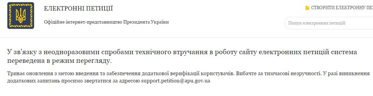 "В связи с неоднократными попытками технического вмешательства в работу сайта электронных петиций система переведена в режим просмотра", - говорится в официальном сообщении на сайте.