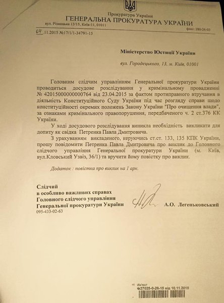 Петренко опубликовал также скан-копию соответствующего письма Генпрокуратуры в адрес Министерства юстиции за подписью следователя по особо важным делам ГСУ Генпрокуратуры Александра Легеньковского от 4 ноября 2015 года.