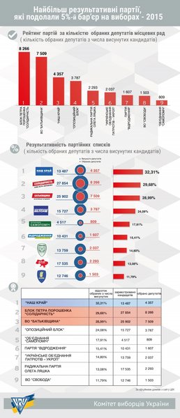 Итого, 5%-ный проходной барьер по результатам местных выборов-2015 преодолели девять партий: БПП "Солидарность", "Батькивщина", Оппозиционный блок, "УКРОП", ВО "Свобода", Радикальная партия Ляшко, "Самопомич", "Наш край" и "Видродження".