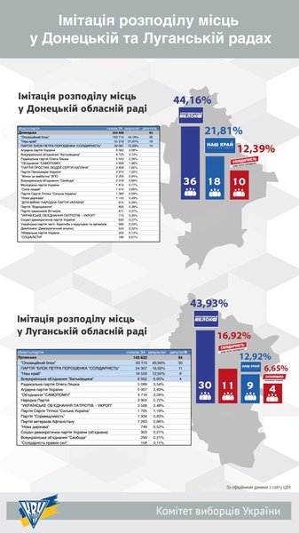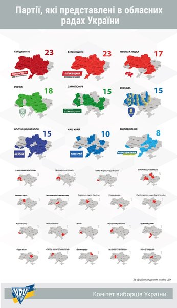 Итого, БПП "Солидарность" и ВО "Батькивщина" получили представительство в 23 советах - 22 областных и Киевском городском совете. "Укроп" и Радикальная партия Ляшко присутствуют, соответственно, в 18 и 17 областных советах. В 15 областных советов избраны представители Оппозиционного блока, "Самопомочи" и ВО "Свобода".