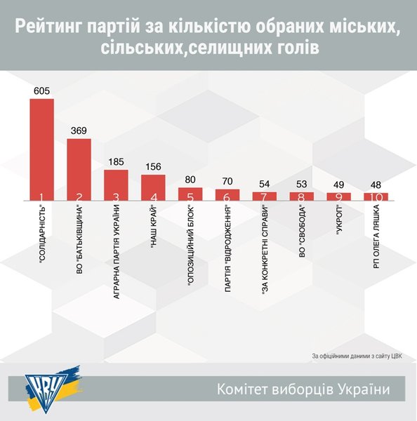 По данным Комитета избирателей Украины, наибольшее количество сельских, поселковых и городских голов были избраны от БПП "Солидарность" - 605 человек. Вторую позицию заняла ВО "Батькивщина" - 369 человек. Аграрная партия Украины по количеству сельских, поселковых и городских голов заняла третье место - 185 человек. Партия "Наш край" заняла четвертое место - 156 представителей на должностях глав городов, сел и поселков. За ней следуют "Оппозиционный блок" (80 человек), "Видродження" (70 человек), "За конкретные дела" (54 человека), ВО "Свобода" (53 человека), Радикальная партия Олега Ляшко (48 человек).
