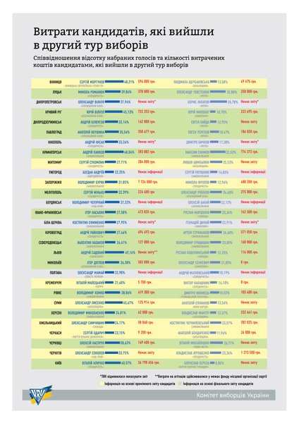 Большинство кандидатов на должности городских глав, которые вышли во второй тур выборов, потратили от 100 тыс. грн до 1 млн грн, сообщает Комитет избирателей Украины.