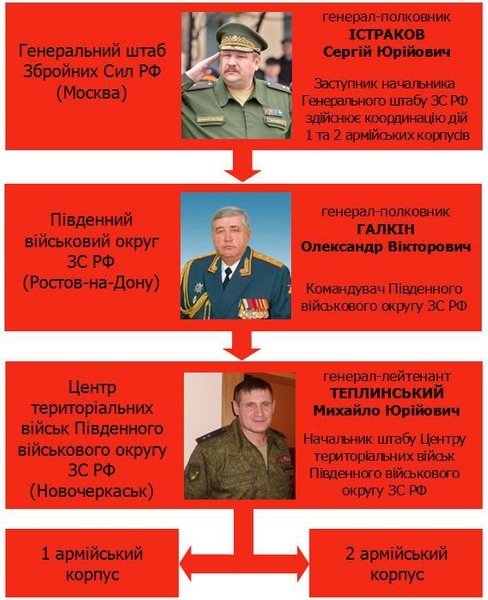 Таким образом, генеральный штаб ВС РФ осуществляет управление группировкой российских войск на Востоке Украины по такой схеме: