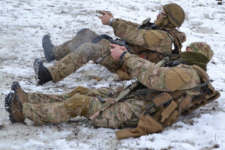 Разведчики в полной амуниции выполняли базовые упражнения по ведению огня из различных положений: стоя, с колена, лежа, в ходе внезапных огневых контактов с левого и правого флангов и тому подобное.