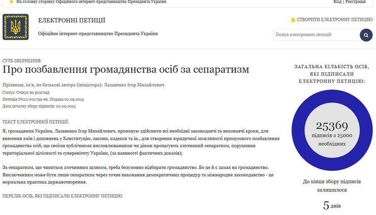 Петиция о лишении гражданства за сепаратистские высказывания или действия набрала 25,3 тыс. подписей, превысив необходимый для рассмотрения порог за 5 дней до конца срока, и будет рассмотрена Президентом Петром Порошенко. Такие данные представлены в разделе электронных петиций официального интернет-представительства главы государства.