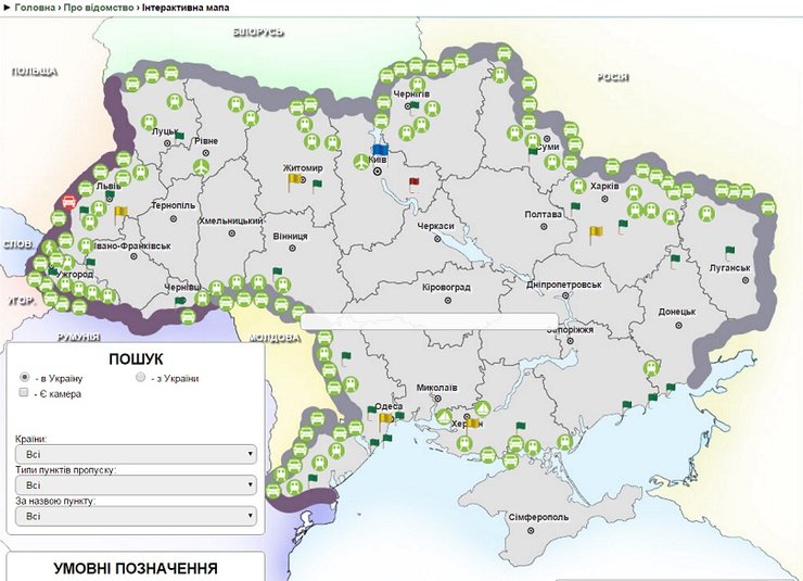 Государственная пограничная служба Украины на своем сайте запустила в тестовом режиме интерактивную карту загруженности основных пропускных пунктов на границах Украины. Об этом сообщил Центр транспортных стратегий.