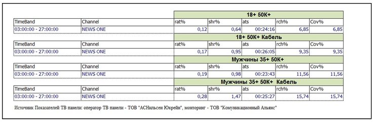 По основной аудитории новостийных каналов - мужской - NewsOne также демонстрирует довольно высокие показатели. По аудитории М 35+ (города 50+) канал вышел на третье место среди информационных каналов с рейтингом 0,19% и долей 0,98%. Самые высокие показатели канал получил среди той же аудитории, смотрящей телевидение в кабеле, и это рейтинг 0,28%, доля 1,47%.