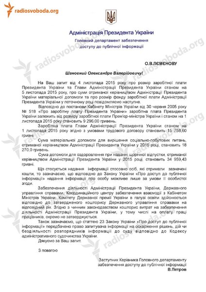 "В соответствии с постановлением Кабмина от 30 июня 2015 года №518 зарплата президента зависит от размера зарплаты премьер-министра и по состоянию на 1 ноября 2015 года составляет 9296 гривен", - говорится в документе.