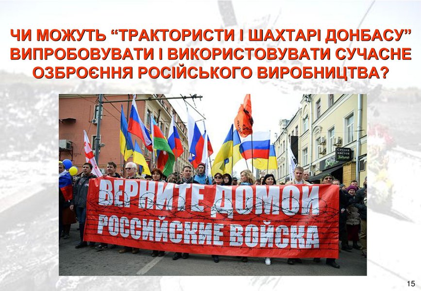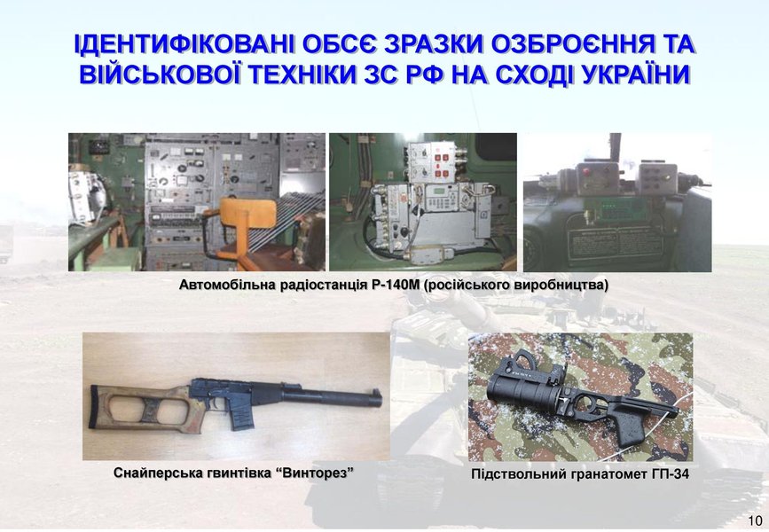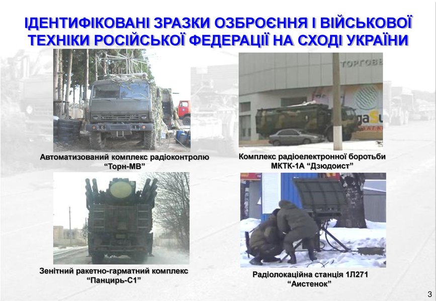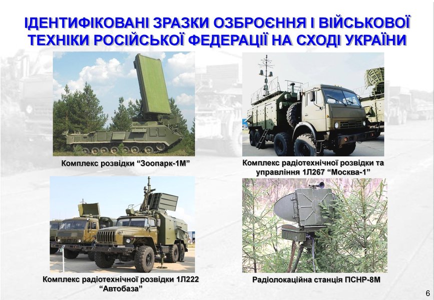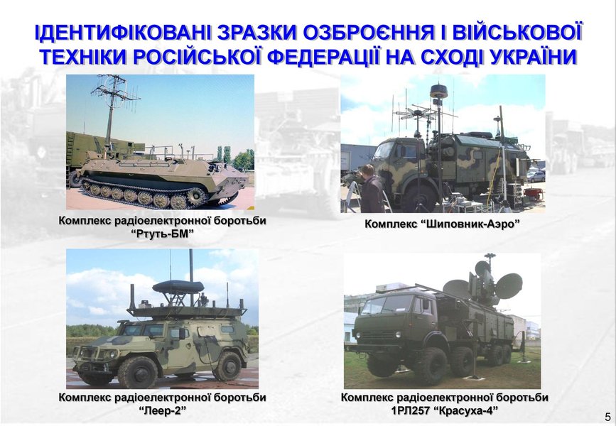 Отмечается, что в боевых действиях на востоке Украины оккупанты испытывают комплексы радиоэлектронной борьбы МКТК-1А "Дзюдоист", "Ртуть-БМ", "Леер-2", 1РЛ257 "Красуха-4", комплекс радиотехнической разведки и управления 1Л267 "Москва-1", комплекс РЕБ 1Л222 "Автобаза", автоматизированный комплекс радиоконтроля "Торн-МВ", комплекс "Шиповник-Аэро", комплекс радиоразведки "Зоопарк-1М".