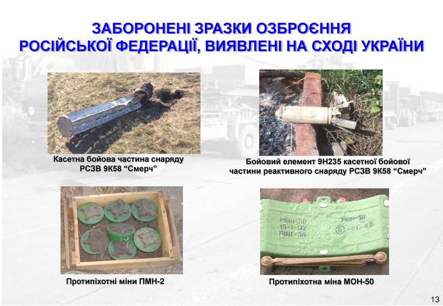 В военной разведке также сообщили о применении запрещенных образцов вооружения РФ, выявленных на востоке Украины. В презентации продемонстрирована кассетная боевая часть снаряда РСЗВ 9К58 "Смерч", боевой элемент 9Н235 кассетной боевой части реактивного снаряда РСЗВ 9К58 "Смерч", противопехотные мины ПМН-2 и МОН-50.