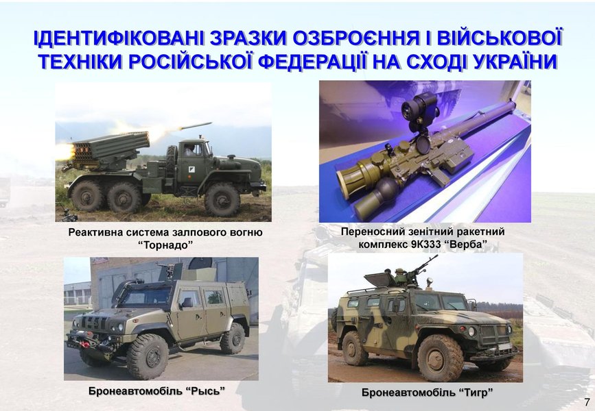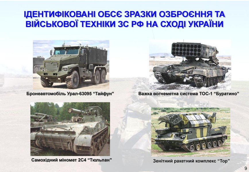 Кроме того, против украинцев применяются такие мощные системы поражения, как реактивная система залпового огня "Торнадо", тяжелая огнеметная система ТОС-1 "Буратино", самоходный миномет 2С4 "Тюльпан". На улицах оккупированных городов Донбасса замечены бронеавтомобили оккупантов "Рысь" и "Тигр", а также Урал-63095 "Тайфун".