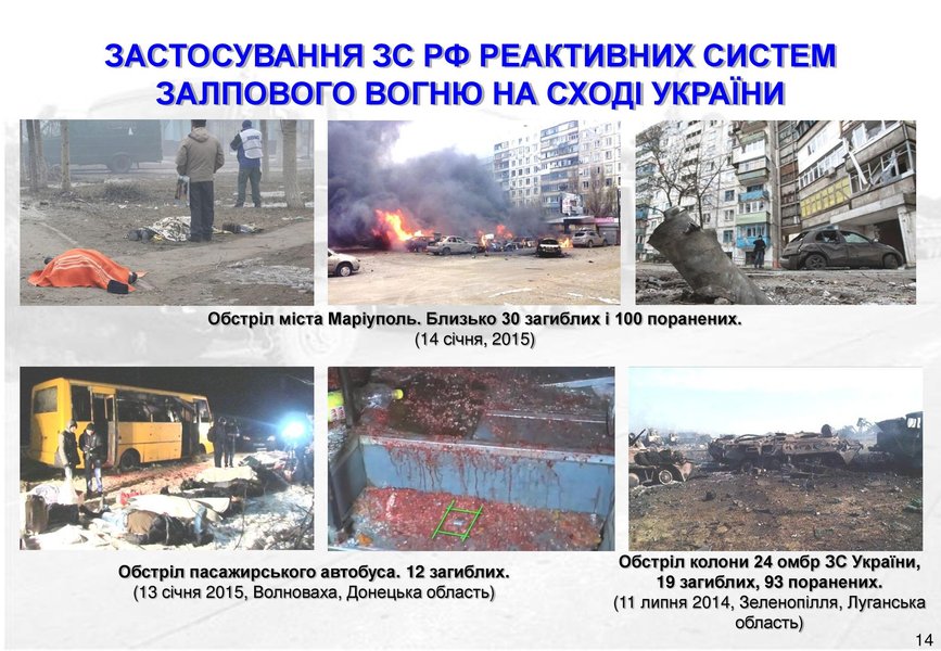 Кроме того, в ГУР напомнили о смертельных применениях оккупантами реактивных систем залпового огня. В частности, это касается обстрела Мариуполя 14 января 2015 года (около 30 погибших, 100 раненых), пассажирского автобуса 13 января 2015 года возле Волновахи (12 погибших), колонны 24 омбр ВСУ 11 июля 2014 года в районе Зеленополья Луганской области (19 погибших, 93 раненых).
