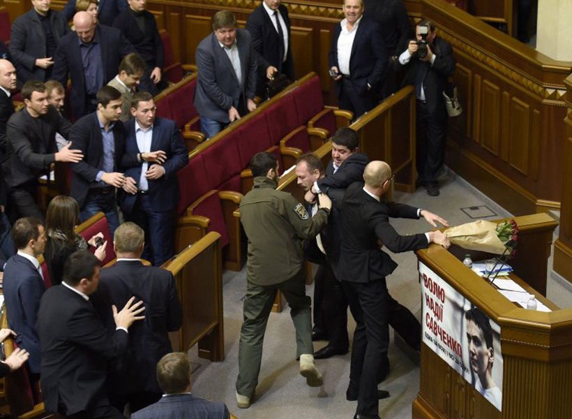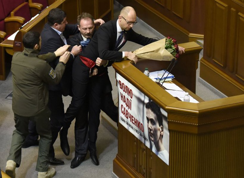 Эскалация произошла после вопроса Дмитрия Лубинца о ситуации в энергетической сфере. "Вы мне задаете вопрос по энергетике. А вы не пробовали вашего министра от БПП Демчишина вызвать на комитет и поговорить с ним?!" - парировал Яценюк. В секторе Блока Порошенко возмущенно зашумели. Некоторые депутаты посчитали излишне резкий тон премьера оскорбительным, и в знак протеста начали покидать сессионный зал. Тут и настала кульминация конфликта. Барна неожиданно схватил букет роз, которым коллеги хотели поздравить именинника Николая Томенко, понес его к трибуне, и, вручив букет премьеру, начал силой оттаскивать того от трибуны. Яценюк не сопротивлялся и Барна применил диковинный прием с захватом через пах, сумев оторвать главу правительства от земли. Яценюку на выручку поспешили его старые друзья. Глава фракции НФ Максим Бурбак просто оттаскивал Барну, а Андрей Иванчук налетел на Барну с кулаками. В итоге разнимать потасовку пришлось даже некоторым членам правительства.