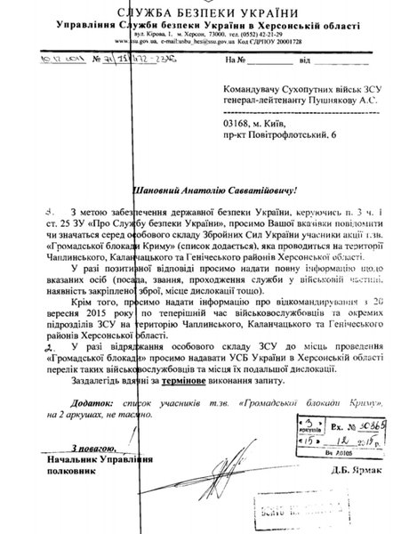 Согласно документу, адресованному командующему Сухопутных войск Анатолию Пушнякову, управление СБУ в Херсонской области просит сообщить, есть ли среди указанных в списке 49 участников "блокады" представители личного состава ВСУ, и были ли откомандированы в места проведения "Блокады" (Чаплинский, Каланчакский и Генический районы) военнослужащие и отдельные подразделения ВСУ в период с 20 сентября 2015 года.