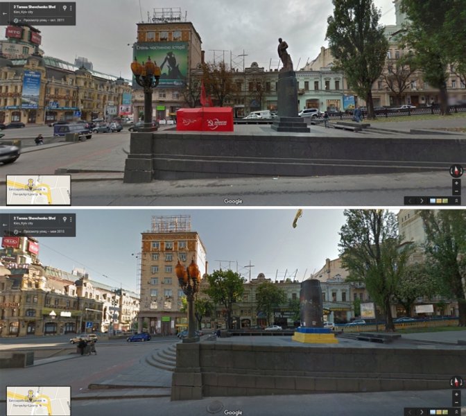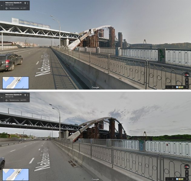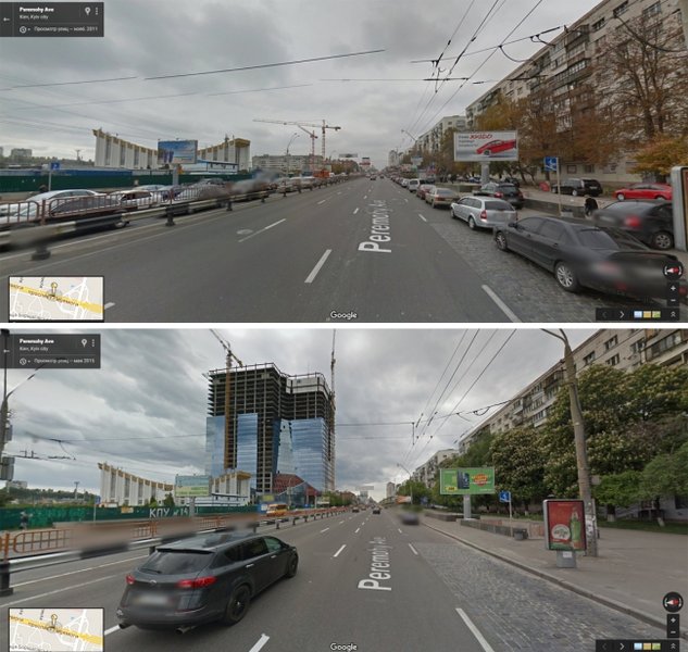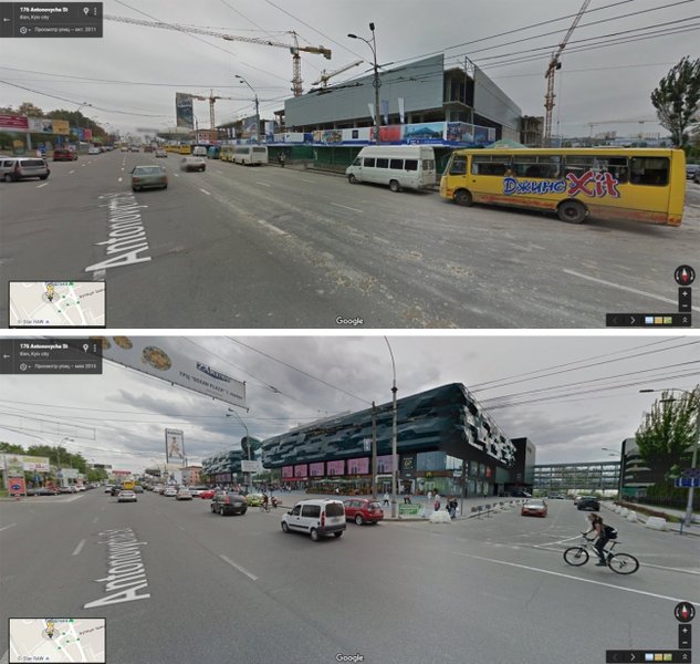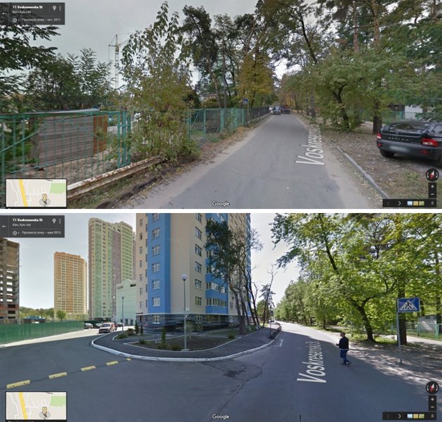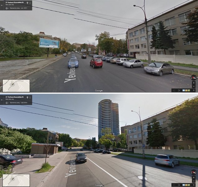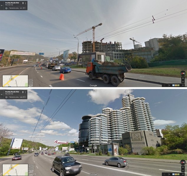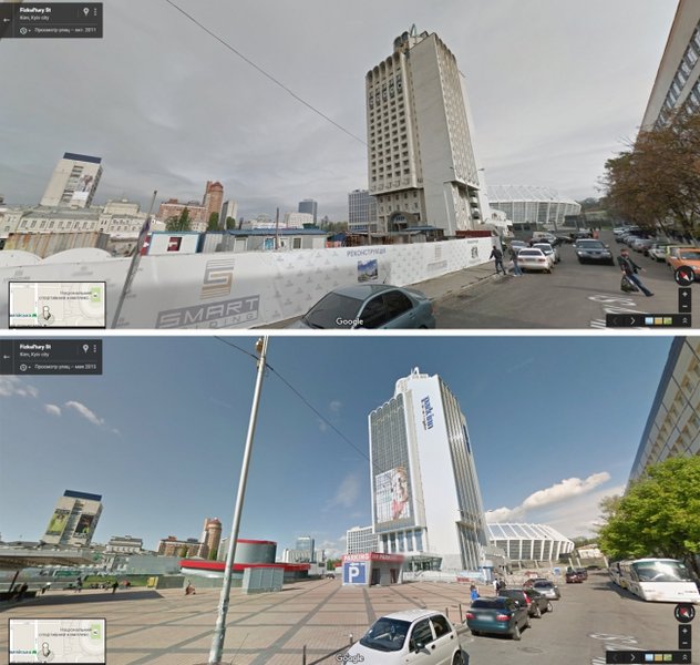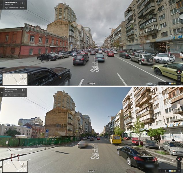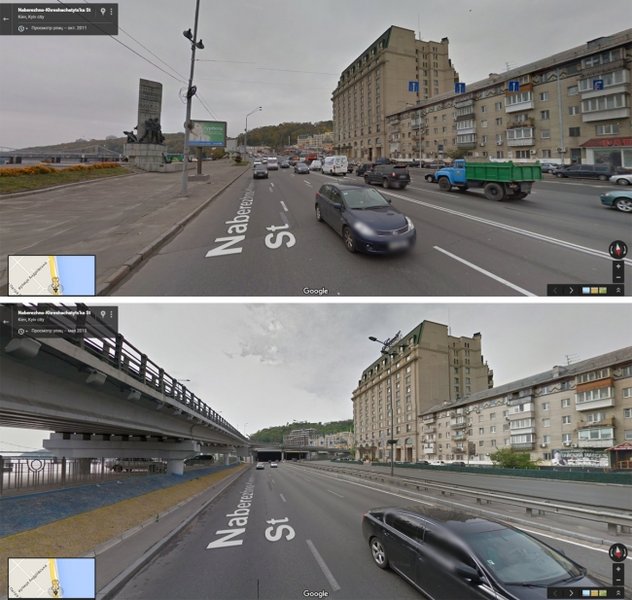 Киевские улицы "глазами гугломобиля" в 2011 и 2015 продемонстрировал львовский блогер Александр Шутюк, сообщают "Украинские новости".
