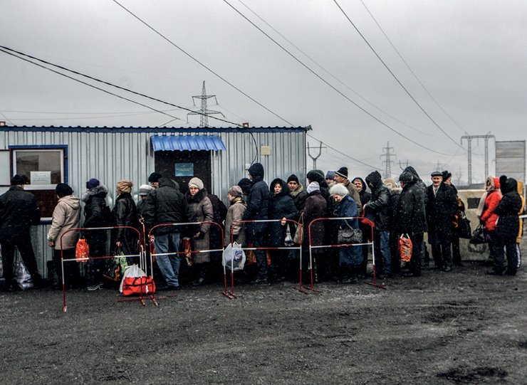 Возле одного из окошек паспортного контроля выстроилась очередь человек из двадцати пяти — в основном люди среднего возраста и пенсионеры. В руках — набитые торбы. Только что они выгрузились из автобуса Донецк — Селидово. Невысокая сухенькая пенсионерка грустно смотрит вдаль на разбитую дорогу в сторону Донецка, крепко прижимая к груди украинский паспорт. То ли от отчаяния, то ли от сильного ветра со снегом глаза ее слезятся.