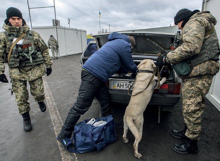 На всех контрольных пунктах история повторяется: военные в добротной зимней форме с автоматами в руках подходят к опущенному окну водителя и просят документы. Наш спутник Юрий изо всех сил демонстрирует спешку, поэтому всякому подошедшему солдату в лицо громко кричит слово "обладминистрация" и суетливо протягивает удостоверение.