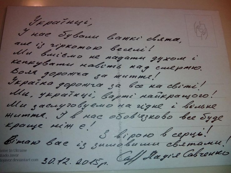 "Украинцы, у нас бывали тяжелые праздники, но с горечью веселые! Мы умеем не падать духом и смеяться даже над смертью. Воля дороже жизни! Украина дороже всего на свете! Мы, украинцы, достойны лучшего. Мы заслуживаем достойной и свободной жизни. И у нас все будет обязательно лучше, чем есть! С верой в сердце! Поздравляю вас с зимними праздниками!" – написала Надежда.