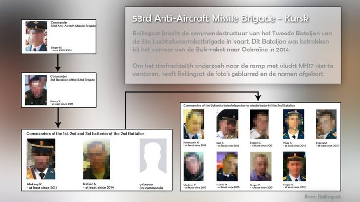 В прошлом году участникам Bellingcat удалось установить, что к крушению MH17 причастен батальон 53-й системы воздушной защиты из Курска. Один из российских военных, упомянутых в расследовании, - Сергей М., командир бригады. Также упоминаются Дмитрий Т. и девять лейтенантов, которые находились в ЗРК "Бук" в день крушения самолета. В расследовании говорится и об "очень опытных солдатах", которые умеют управлять установкой.